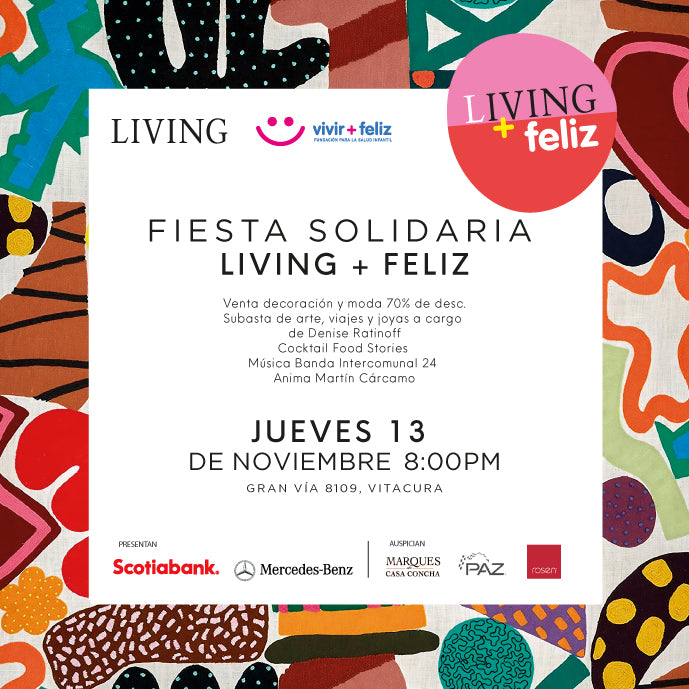 Gran evento solidario de revista Living en beneficio de la fundación Vivir + Feliz. Una casa completamente decorada donde todo estará a la venta con un 70% de descuento. También subasta de arte, viajes y joyas a cargo de Denise Ratinoff, música de la banda Intercomunal 24 y cocktail de Food Stories.